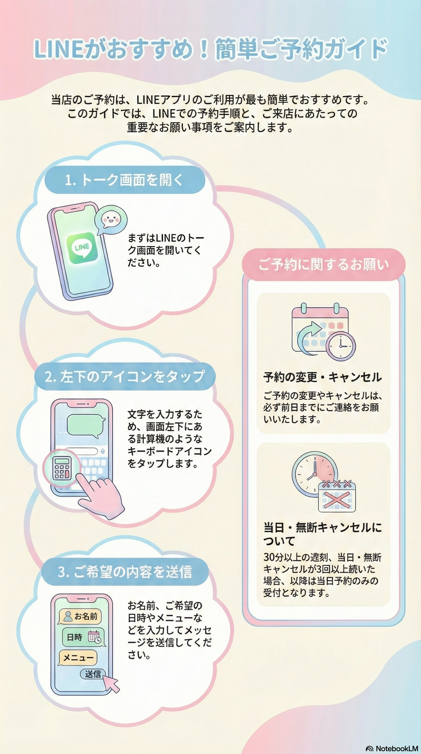 - ご予約キャンセル及び変更は前日までにご連絡いただきますようご理解・ご協力お願い申し上げます。