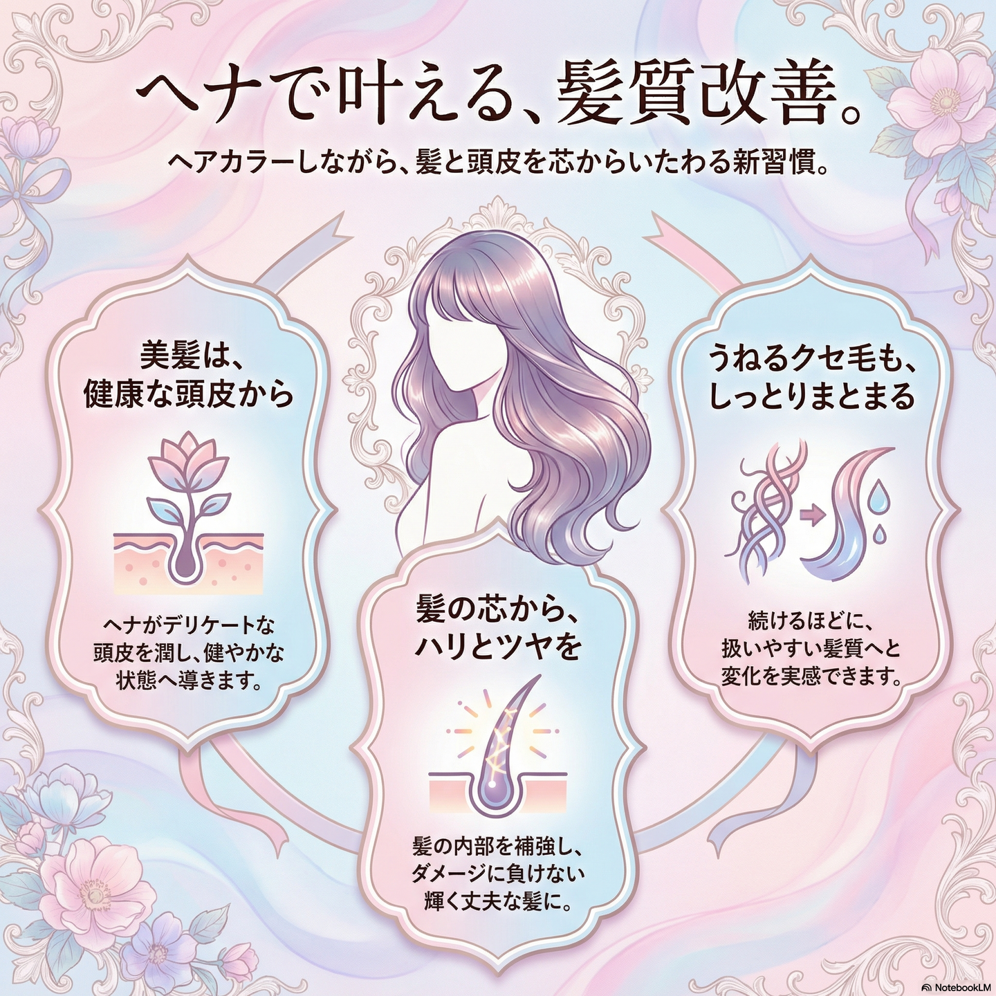 ヘナの成分のタンニンが毛先に定着するのでクセ毛の種類によっては収まりのいいまとまった髪質になる人もいます。長年続けることで変化していくケースが多いです。