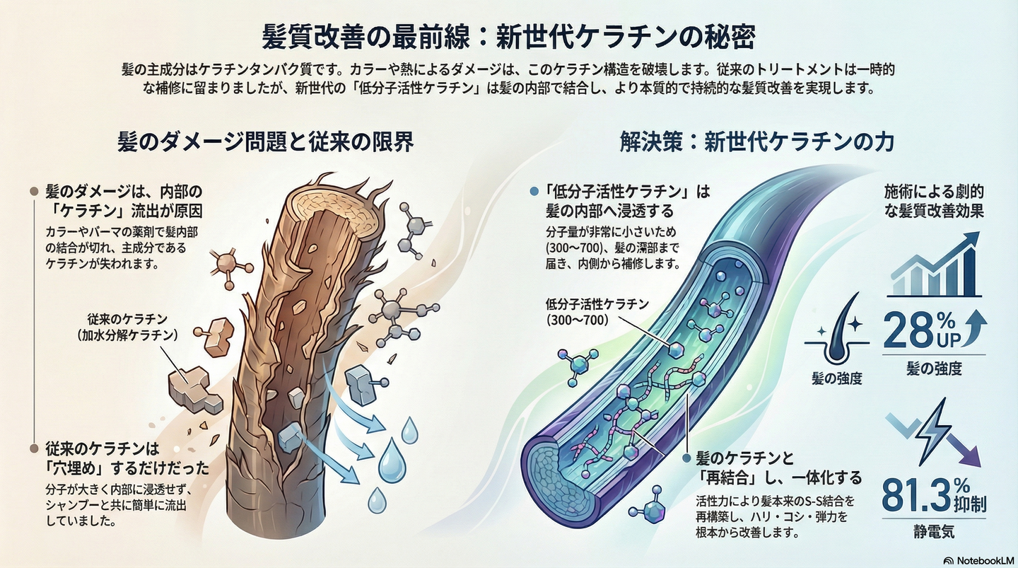 高分子活性型ケラチンを髪に補充してCMCでシールド。