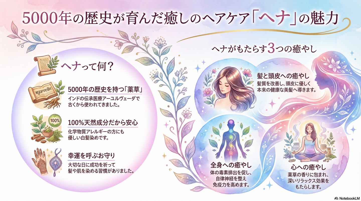 5000年前からインドの伝承医療『アーユルヴェーダ』でヘナは代謝を促し体の毒素を排出自律神経が整い免疫力を高めると言われ、医療行為に使われていました。特にリラックスしているときのは毛穴から吸収されやすいので美容室でのヘナ染めがおすすめです。