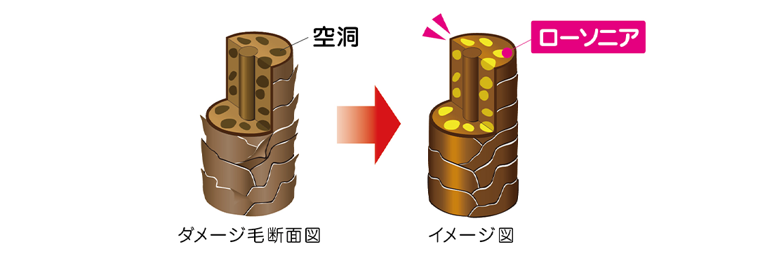 が髪表面とキューティクルの内部に吸着し補強することで、ケラチンの流出を防いで輝く丈夫な髪に。
